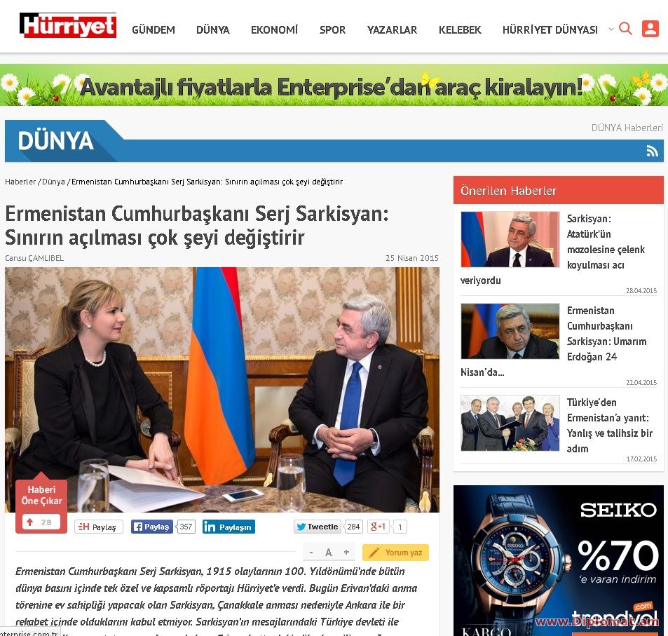 The Armenian President’s answer created a huge storm of controversy in Turkey and Azerbaijan. Journalists and officials in both countries mounted hysterical attacks on Armenia, accusing Pres. Sargsyan of “urging Armenian youth to occupy Mt. Ararat and Eastern Turkey.” Insulting adjectives were hurled at Pres. Sargsyan by Turkey’s then Prime Minister Erdogan, Deputy Prime Minister Bulent Arinc, Minister Egemen Bagis, Pres. Ilham Aliyev of Azerbaijan, and the Foreign Ministries of both countries. Erdogan even demanded an apology from Armenia’s President. To incite the masses, protests were organized in Turkish cities where photographs of Pres. Sargsyan were burned!