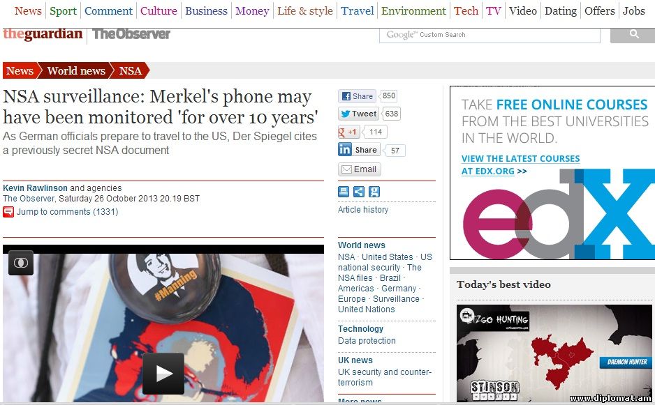 THEGUARDIAN: NSA SURVEILLANCE: MERKEL'S PHONE MAY HAVE BEEN MONITORED 'FOR OVER 10 YEARS'