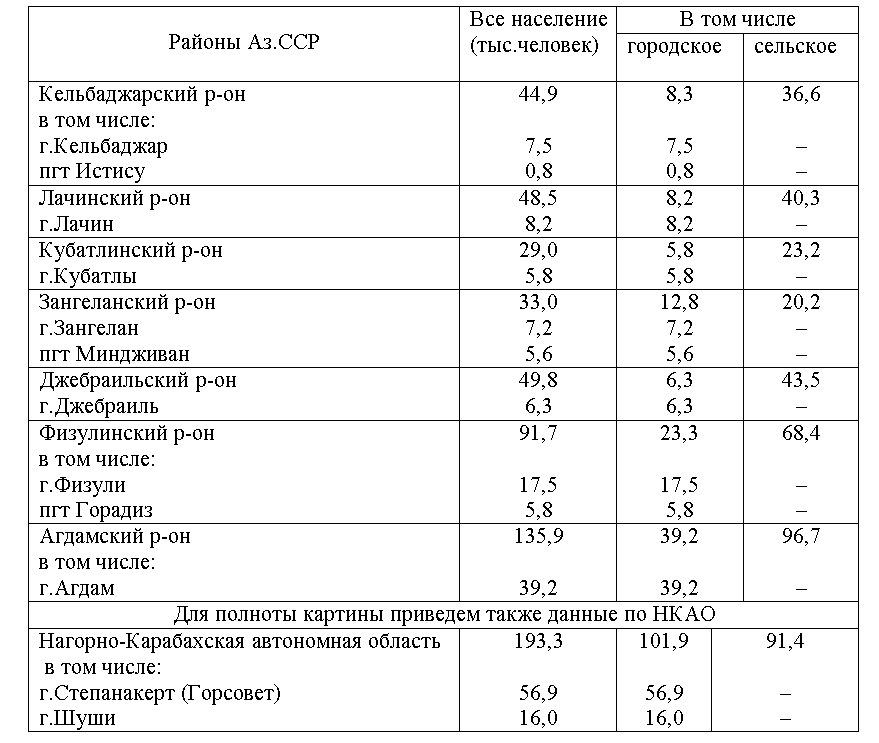 ЛЕНСЕР АГАЛОВЯНАкадемик НАН Армении, доктор физ.-мат. наук, профессор, ЕРЕВАН Лет десять назад в зале заседаний Президиума НАН Армении мною был оглашен весьма важный документ–численность населения Азерб.ССР, в частности, семи прилегающих к НКР районов, на 1 января 1991г. по данным статистического сборника «Численность населения Союзных республик по городским поселениям и районам на 1 января 1991г.», Москва, Информационно-издательский центр Госкомитета СССР, 1991г. К этому времени все азербайджанцы-турки безоблачно жили в своих домах и не было даже намека на их переселение из этих семи районов в другие места Азербайджана. Давайте вместе посчитаем их реальное количество по приводимой ниже документальной таблице из этого сборника. Учтем также, что под контролем Армии Самообороны НКР находятся 35 территории Агдамского и 25 Физулинского районов, а жители городов Агдам, Физули, пгт Горадиз перед военными столкновениями покинули места постоянного проживания.Число жителей, покинувших свои места проживания: первых пяти районов (44,9+48,5+29,0+33,0+49,8=205,2 тыс.чел.) равно 205,2 тыс. человек Агдамского района ((135,9-39,2)х0,35+39,2=96,7х0,35+39,2=33,845+39,2 = 73,045 тыс) равно 73,045 тыс. чел Физулинского района ((91,7-23,3)х0,25+23,3=68,4х0,25+23,3=17,1+23,3=40,4 тыс.) равно 40,4 тыс. чел. Таким образом, из семи вышеуказанных районов покинуло 318,645 тыс. жителей. В НКР тогда проживало примерно 43 тыс.азери-турков. Общее число переселенцев (а не беженцев) 318,645+43=361,645362,0 тыс.человек. Правда до миллиона далеко? 166 тыс. азербайджанцев, покинувших Армению, никак нельзя считать беженцами, поскольку все они с помощью властей Армении перевезли в Азербайджан все свое имущество и выгодно для себя обменяли свои квартиры и дома. Более того, часть из них, жившая в зоне Спитакского землетрясения, получила (даже после отъезда) дополнительную финансовую и материальную помощь. Любопытно, что азербайджанцы покинули зону землетрясения буквально за несколько дней до землетрясения, что побудило некоторым аналитикам считать, что землетрясение 1988г. вызвано искусственно. Нарочно завышая количество переселенцев-беженцев (где 362 тыс., где миллион!), Азербайджан преследовал по крайней мере две цели: первая–ох какие плохие эти армяне, посмотрите сколько у нас беженцев вторая (главная)–получить от международных гуманитарных организаций больше финансовой и материальной помощи! Стыдно, господин Ильхам Алиев! Считаю, что давно пора нашим историкам быть начеку и в лучших традициях почтенного Баграта Улубабяна неустанно дать достойный отпор фальсификаторам истории. Резюмируя вышесказанное, можно констатировать: 1) Армяне Арцах-Карабаха аборигены испокон веков 2) Освобожденные Армией Самообороны НКР территории являются частью исторической Родины 3) После распада СССР на территории, занятой бывшей Аз.ССР, на основе действующих тогда Законов СССР и международного юридического права, образовались две независимые страны–Азербайджанская Республика (АР ) и Нагорно-Карабахская Республика (НКР) 4) Вследствие вероломного нападения АР на НКР и отпора Армией Самообороны НКР агрессора, создано сегодняшнее статус-кво 5) Существующий между АР и Турцией армянский клин с раствором 160 км является залогом для существования армянского государства и непреодолимой преградой для осуществления идеи пантуркизма-создания единого сверхмощного туркоязычног