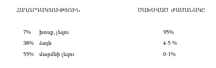 Մարդաբան Ռեյ Բրեդվիստելը եկել է այն եզրակացության, որ մարդը միջին հաշվով օրվա ընթացքում խոսում է ընդամենը 10-11 րոպե, իսկ նախադասության տևողությունը միջին հաշվով կազմում է 2,5 վայրկյան:Եթե դուք չեք կարողանում վերծանել ոչ վերբալ հաղորդակցության լեզուն, ապա տասը խոսքից ընկալում եք ընդամենը երեքը: Այնպես որ հաղորդակցության վերջնական արդյունքը կախված է նրանից, թե ինչ ենք տեսնում, այլ ոչ թե ինչ եք լսում: Սակայն հասկանալ, թե ինչ է ասում մարդը ժեստերի և ազդանշանների ձևով դառնում է պրոբլեմատիկ, եթե հաշվի առնենք, որ որոշ մասնագետների կարծիքով, նրա մարմինն արձակում է մինչև տասը միլիոն (!) ազդանշան: Այն, ինչը մենք անվանում ենք վեցերորդ զգայարան կամ ինտուիցիա, ոչ այլ ինչ է, եթե ոչ մարմնի լեզուն կարդալու և այն խոսքային լեզվի հետ համեմատելու ու ճիշտ վերծանելու ունակություն: Ուժեղ ինտուիցիայով օժտված անձինք բոլորովին անծանոթ մարդկանց մասին ‹‹հոտառությամբ›› գուշակություն անելիս հասնում են մինչև 80 % ճշգրտության: Նրանք անսխալ մեկնաբանում են մարմնի լեզուն, հասկանում են մարդու էությունը, անշուշտ` ապավինելով նաև հավանականության տեսությանը: Շառլատանների և բախտախնդիրների կողքին, որոնք այս հարցում շահարկում են մարդկանց վստահությունը, իրոք կան տաղադավոր մարդիկ, ինչպես, օրինակ, հռչակավոր Վոլֆ Մեսինգն էր իր ապշեցուցիչ պայծառատեսությամբ և կանխագուշակությամբ: Նրա խորհուրդներից օգտվում էր Ստալինը: Անժխտելի է Վանգայի երևույթը: Շատ մեծ մտածողներ են կարևորել ոչ վերբալ հաղորդակցության կարևորությունը անձի ճանաչման գործում: ‹‹Մարդու խոսքից կարելի է տեսնել, թե ինչ անուն է նա ուզում վաստակել, իսկ թե ինչ է նա իրենից, իրոք, ներկայացնում կարելի է գուշակել միայն նրա դիմախաղի, ժեստերի և մարմնի շարժումների միջոցով››,- այսպես է ասել գերմանացի մեծանուն դրամատուրգ ֆրիդրիխ Շիլլերը: | |