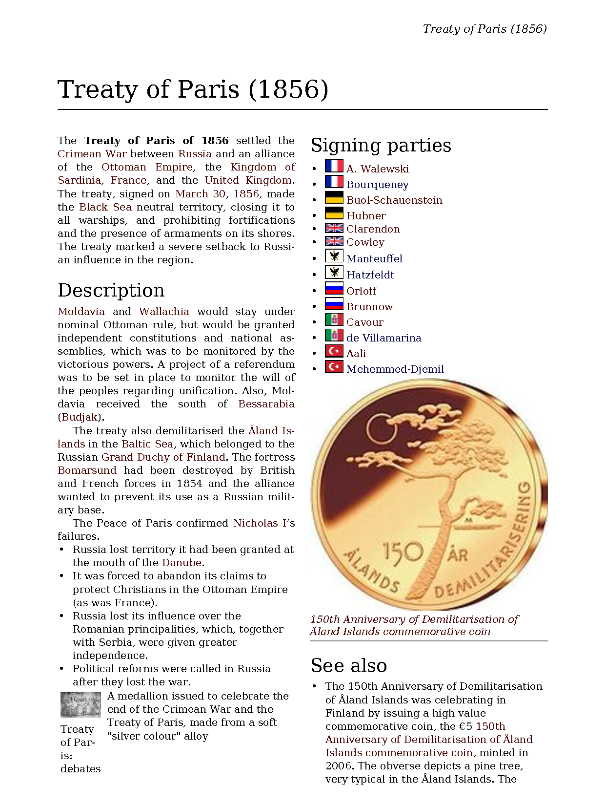 1856թ. մարտի 30-ին կնքված Փարիզի հաշտության պայմանագրով ավարտվեց 1853-56թթ. Ղրիմի պատերազմը: Ռուսաստանը վերադարձնում էր Թուրքիային Կարսը ի փոխանակումն Սևաստոպոլի և դաշնակիցների կողմից գրավված ռուսական մյուս քաղաքների: Փարիզի պայմանագրի կնքումից հետո արևելյան հարցն ավելի սրվեց, հատկապես 1870-ական թվականներին: 1877-78թթ. ռուս-թուրքական պատերազմում Ռուսաստանի հաղթանակից հետո Փարիզի հաշտության պայմանագիրը 1878թ. փոխարինվեց Բեռլինի պայմանագրով: Փարիզի պայմանագիրը բաղկացած էր 33 հոդվածներից: Մյուս հոդվածները վերաբերում են Դանուբյան իշխանությունների, Մոլդովիայի ու Վալախիայի նոր ռեժիմին, Բոսֆորի ու Դարդանելի նեղուցներին: ՓԱՐԻԶԻ ՊԱՅՄԱՆԱԳԻՐԸ 18/30 մարտի, 1856 թ. Հոդված 3. Նորին Մեծություն Ամենայն ռուսաց կայսրը պարտավորվում է Նորին Մեծություն սուլթանին վերադարձնել Կարս քաղաքը՝ նրա միջնաբերդով հանդերձ, ինչպես նաև օսմանյան տիրապետությունների այն մասերը, որոնք գրավված են ռուսական զորքերի կողմից: ![]() Հոդված 30. Նորին Մեծություն Ամենայն ռուսաց կայսրը և Նորին Մեծություն սուլթանը ամբողջությամբ պահպանում են իրենց տիրույթները Ասիայում, այն կազմով, որպիսին նրանք ունեին օրինաբար մինչև խզումը: Տեղային ամեն տեսակի վեճերից խուսափելու համար սահմանագծերը կստուգվեն և կարիքի դեպքում կշտկվեն, բայց այնպես, որպեսզի հողային տիրակալության մեջ դրանից տեղի չունենա որևէ կորուստ ոչ մեկ, ոչ մյուս կողմի համար: Այսպիսի դեպքում ռուսական արքունիքի և Բարձր Դռան միջև դիվանագիտական հարաբերությունների վերականգնումից անմիջապես հետո սահմանավայր կուղարկվի երկու ռուսական կոմիսարներից, երկու օսմանյան կոմիսարներից, մեկ ֆրանսիական կոմիսարից և մեկ անգլիական կոմիսարից կազմված հանձնաժողով: Հանձնաժողովը պետք է իր վրա դրված գործը կատարի ութ ամսվա ընթացքում՝ հաշվելով սույն պայմանագրի վավերացումների փոխանակման օրից: | |
